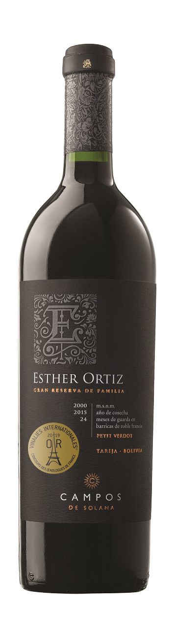 Una de las etiquetas de alta gama de Campos de Solana que estuvo presente es Esther Ortiz. Se trata de un vino de Gran Reserva, con una crianza de 24 meses en barricas de roble francés nuevas. Esta bebida está elaborada en un 100% con uvas de la variedad Petit Verdot, que es una cepa de difícil cultivo en los viñedos sudamericanos, pero que, en la Finca Esther Ortiz, de la bodega, encuentra el suelo y clima adecuados para dar los vinos más excelsos.