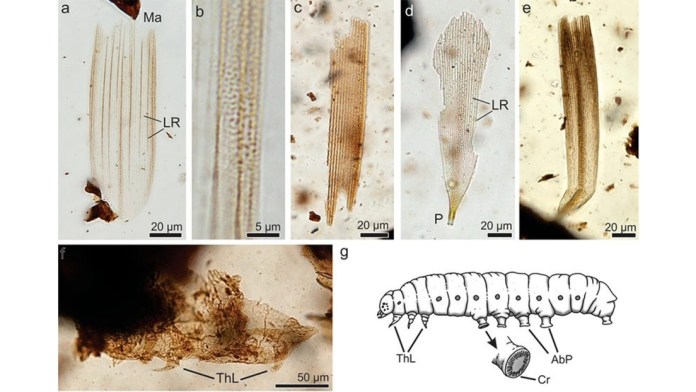 Los especialistas extrajeron el polen y las esporas de helechos de 60 rocas recolectadas del yacimiento geológico y, al observar estas muestras orgánicas con microscopio, lograron identificar «mandíbulas, cabezas con ojos y pelos», así como «diversos tipos de patas y otras estructuras muy raras que no pertenecían a ninguna planta, sino claramente a insectos».