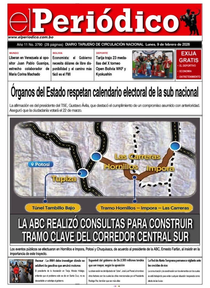 InicioTapasTapa PrincipalEdición 09-02-2026 Edición 09-02-2026 Por El Periódico 9 febrero, 2026 FacebookTwitterWhatsApp Comparte esto: Comparte en Facebook (Se abre en una ventana nueva) Facebook Compartir en X (Se abre en una ventana nueva) X ARTÍCULOS RELACIONADOS Tapa Tecnología Suplemento del Día 10 febrero, 2026 Tapa Deportivo Edición Deportiva 10-02-2026 10 febrero, 2026 Tapa Principal Edición 10-02-2026 10 febrero, 2026 LO MÁS LEIDO ABC realizó consultas para construir tramo clave del Corredor Central Sur Tragedia: Ciclista muere tras ser embestido por un vehículo El Chaco en emergencia por decreto para la construcción del túnel del Aguarague Luciana Campero cuestiona a Johnny Torres y exige licencia del alcalde tras debate Edición 09-02-2026