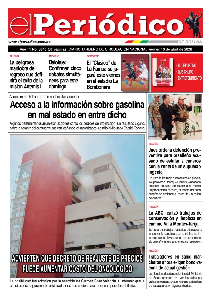 InicioTapasTapa PrincipalEdición 10-04-2026 Edición 10-04-2026 Por El Periódico 10 abril, 2026 FacebookXWhatsApp Comparte esto: Comparte en Facebook (Se abre en una ventana nueva) Facebook Compartir en X (Se abre en una ventana nueva) X ARTÍCULOS RELACIONADOS Tapa Principal Edición 13-04-2026 13 abril, 2026 Tapa Deportivo Edición Deportiva 12-04-2026 12 abril, 2026 Tapa Que Churo Suplemento del Día 10 abril, 2026 LO MÁS LEIDO Macabro: un chico de 17 años asesinó a su madre y a su padrastro y convivió con los cuerpos por dos semanas Falta de gas natural puede ocasionar colapso energético y económico: Montes Edición 15-04-2026 50-50 será paso cuasi federal, afirmó el Presidente Paz en acto por Tarija Edición 14-04-2026