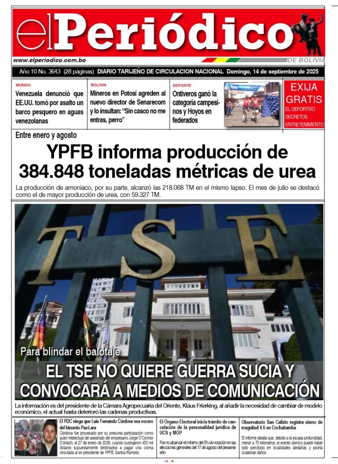 InicioTapasTapa PrincipalEdición 14-09-2025 Edición 14-09-2025 Por El Periódico 14 septiembre, 2025 FacebookXWhatsApp Comparte esto: Comparte en Facebook (Se abre en una ventana nueva) Facebook Compartir en X (Se abre en una ventana nueva) X ARTÍCULOS RELACIONADOS Tapa Deportivo Edición Deportiva 31-03-2026 31 marzo, 2026 Tapa Tecnología Suplemento del Día 31-03-2026 31 marzo, 2026 Tapa Principal Edición 31-03-2026 31 marzo, 2026 LO MÁS LEIDO Tribunal Agroambiental apartó a juezque paró ingreso petrolero a Tariquía La Fiscalía investiga infanticidio yse presume que la autora se suicidó Amenities sí o no: el impacto real en las expensas que sorprende a los propietarios Aprehenden a Nemesia Achacollo en Santa Cruz Edición 31-03-2026