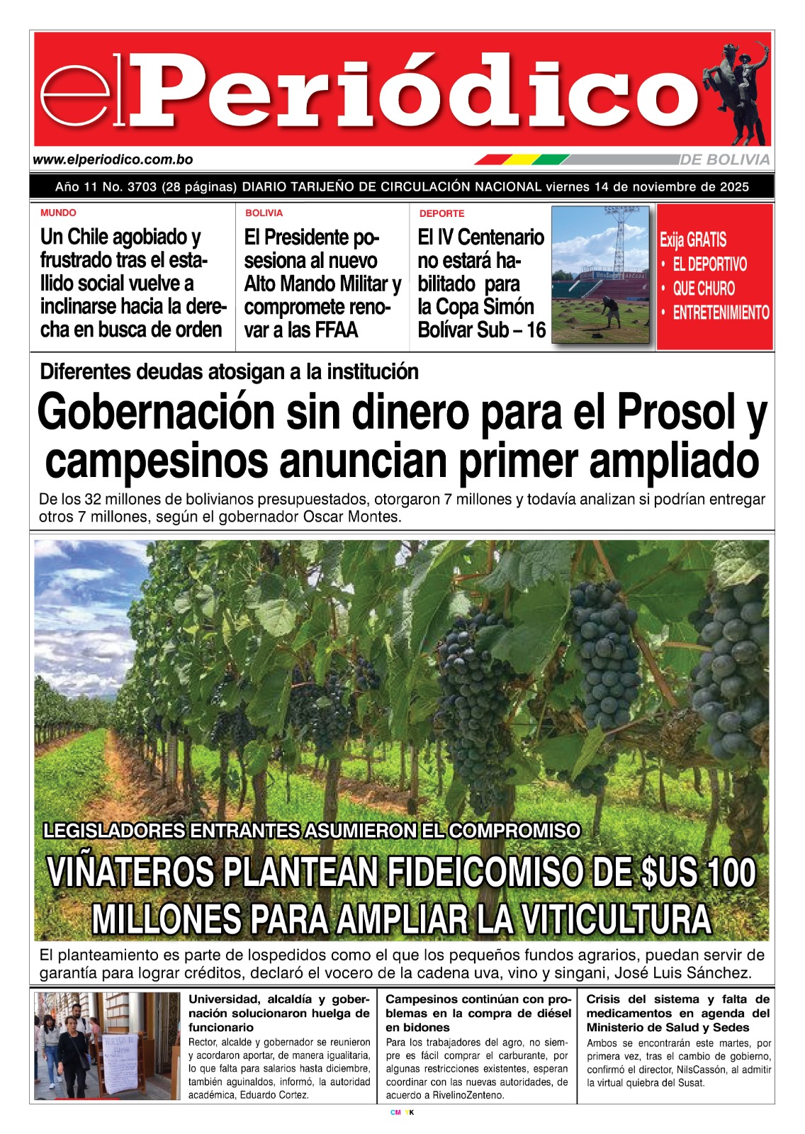 InicioTapasTapa PrincipalEdición 14-11-2025 Edición 14-11-2025 Por El Periódico 14 noviembre, 2025 FacebookXWhatsApp Comparte esto: Comparte en Facebook (Se abre en una ventana nueva) Facebook Compartir en X (Se abre en una ventana nueva) X ARTÍCULOS RELACIONADOS Tapa Tecnología Suplemento del Día 28-04-2026 28 abril, 2026 Tapa Deportivo Edición Deportiva 28-04-2026 28 abril, 2026 Tapa Principal Edición 28-04-2026 28 abril, 2026 LO MÁS LEIDO Gobernadora calificó de “preocupante y alarmante” datos de situación financiera Nuevo aumento salarial inviabilizaría a “un montón” de empresas públicas Planta de cítricos no funcionará nunca reconoció el subgobernador de Bermejo Tarija: detención preventiva para acusado de matar a golpes a joven en céntrica avenida La ABC ejecuta Plan de Emergencia en rutas de Tarija, Santa Cruz y La Paz
