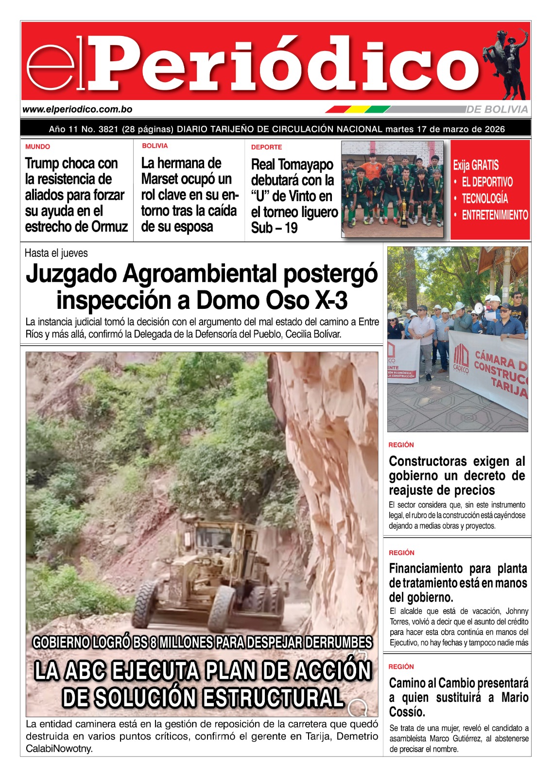 InicioTapasTapa PrincipalEdición 17-03-2026 Edición 17-03-2026 Por El Periódico 17 marzo, 2026 FacebookXWhatsApp Comparte esto: Comparte en Facebook (Se abre en una ventana nueva) Facebook Compartir en X (Se abre en una ventana nueva) X ARTÍCULOS RELACIONADOS Tapa Tecnología Suplemento del Día 28-04-2026 28 abril, 2026 Tapa Deportivo Edición Deportiva 28-04-2026 28 abril, 2026 Tapa Principal Edición 28-04-2026 28 abril, 2026 LO MÁS LEIDO Nombran nuevo comandante en Tarija para fortalecer la gestión institucional Fiscalía entregó a comisión de diputados más de 170 pruebas contra Evo Morales Tarija: detención preventiva para acusado de matar a golpes a joven en céntrica avenida Huelga de hambre por el 45% se complicó con retención de empleados de la Asamblea Detuvieron a dos personas en Bermejo por estupro tras desaparición de menor