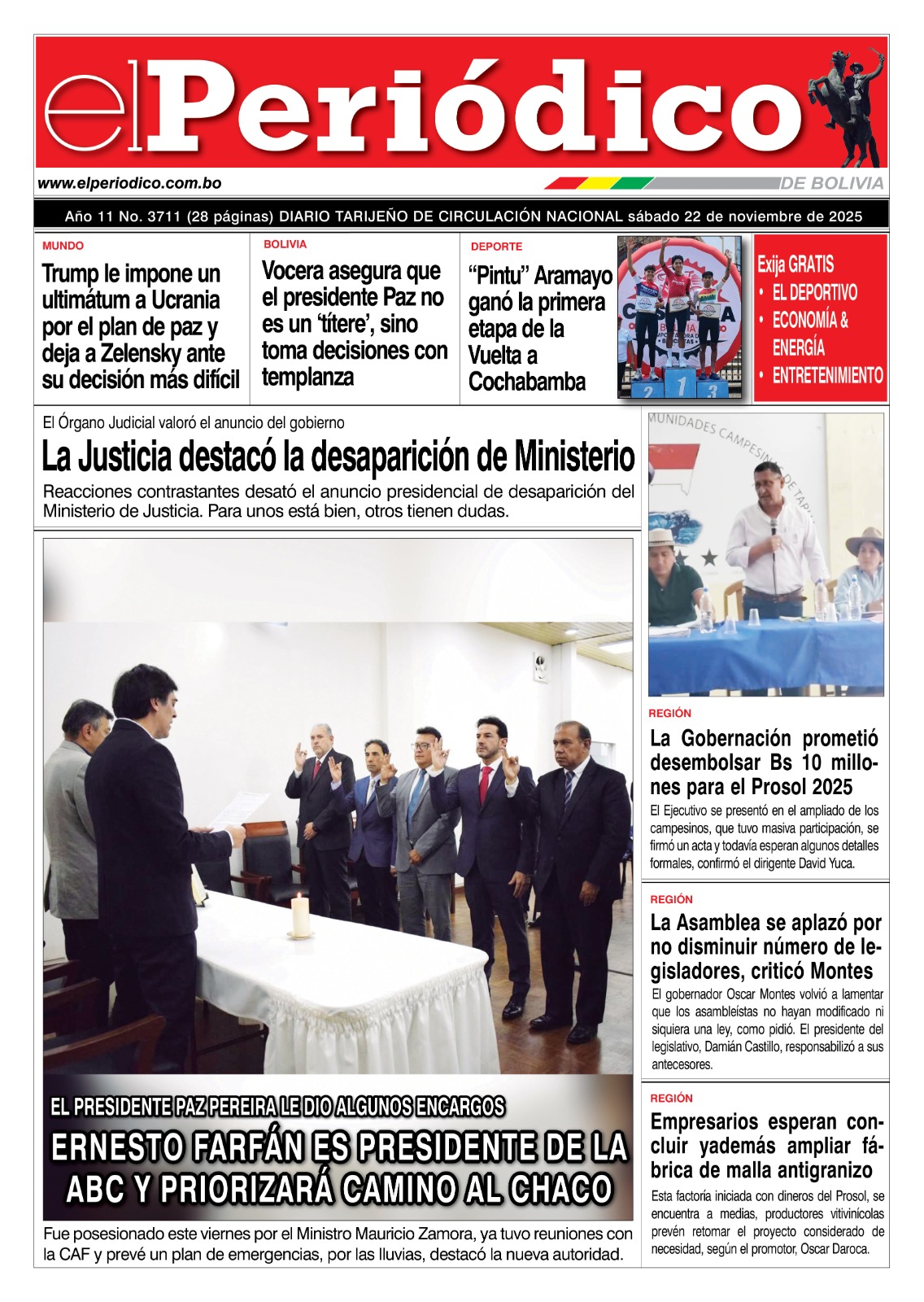 InicioTapasTapa PrincipalEdición 22-11-2025 Edición 22-11-2025 Por El Periódico 22 noviembre, 2025 FacebookXWhatsApp Comparte esto: Comparte en Facebook (Se abre en una ventana nueva) Facebook Compartir en X (Se abre en una ventana nueva) X ARTÍCULOS RELACIONADOS Tapa Deportivo Edición Deportiva 5-04-2026 5 abril, 2026 Tapa Principal Edición 5-04-2026 5 abril, 2026 Tapa Deportivo Edición Deportiva 4-04-2026 4 abril, 2026 LO MÁS LEIDO El estudio para asfaltado de Impora-Hornillos tiene un avance del 80% Edición 5-04-2026 Presentaron proyecto de ley nacional para redistribución del 50-50 de recursos Paquete alimentario tiene registrados 900 nuevos beneficiarios para este año Hospital “Fray Quebracho” es de tercer nivel por Resolución de la gobernación