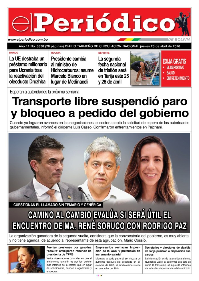 InicioTapasTapa PrincipalEdición 23-04-2026 Edición 23-04-2026 Por El Periódico 23 abril, 2026 FacebookXWhatsApp Comparte esto: Comparte en Facebook (Se abre en una ventana nueva) Facebook Compartir en X (Se abre en una ventana nueva) X ARTÍCULOS RELACIONADOS Tapa Deportivo Edición Deportiva 23-04-2026 23 abril, 2026 Tapa Principal Edición 21-04-2026 21 abril, 2026 Tapa Deportivo Edición Deportiva 21-04-2026 21 abril, 2026 LO MÁS LEIDO YPFB aseguró a Asosur que ya no existe problema con la calidad de la gasolina Día del Malbec: 15 vinos que marcan tendencia y que todos quieren probar Prevén beneficiar a 52 mil contribuyentes con la ley aprobada de alivio tributario Edición 25-04-2026 Economista estima que el precio del dólar continuará subiendo en el país