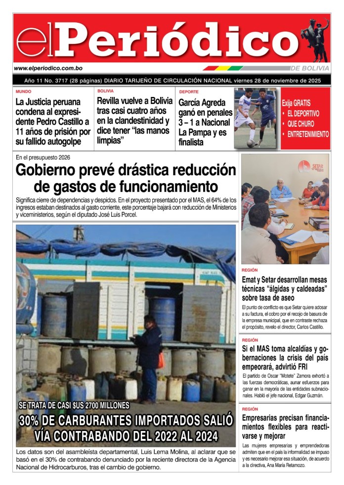 InicioTapasTapa PrincipalEdición 28-11-2025 Edición 28-11-2025 Por El Periódico 28 noviembre, 2025 FacebookXWhatsApp Comparte esto: Comparte en Facebook (Se abre en una ventana nueva) Facebook Compartir en X (Se abre en una ventana nueva) X ARTÍCULOS RELACIONADOS Tapa Deportivo Edición Deportiva 31-03-2026 31 marzo, 2026 Tapa Tecnología Suplemento del Día 31-03-2026 31 marzo, 2026 Tapa Principal Edición 31-03-2026 31 marzo, 2026 LO MÁS LEIDO Tribunal Agroambiental apartó a juezque paró ingreso petrolero a Tariquía La Fiscalía investiga infanticidio yse presume que la autora se suicidó Amenities sí o no: el impacto real en las expensas que sorprende a los propietarios Edición 31-03-2026 Aprehenden a Nemesia Achacollo en Santa Cruz