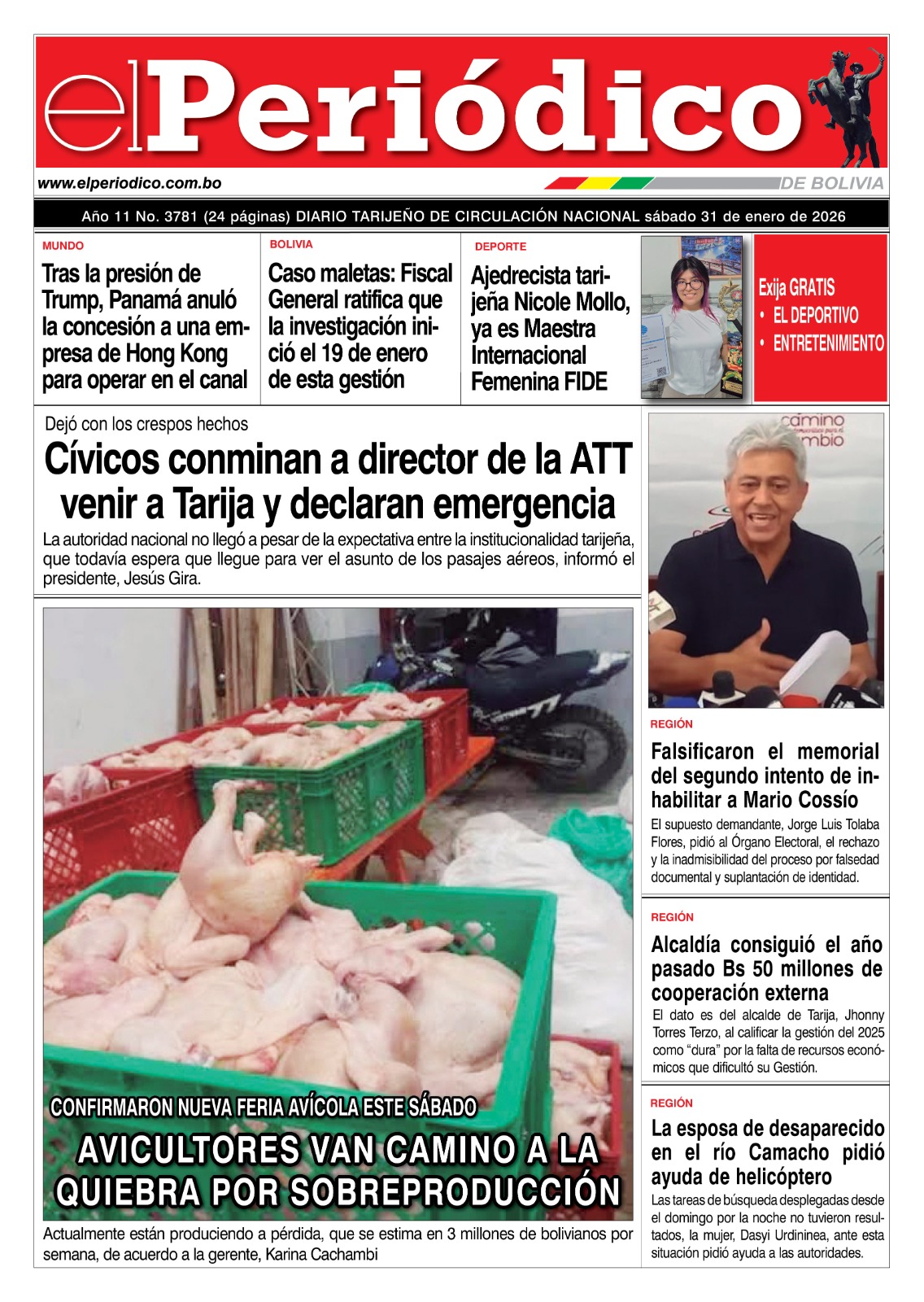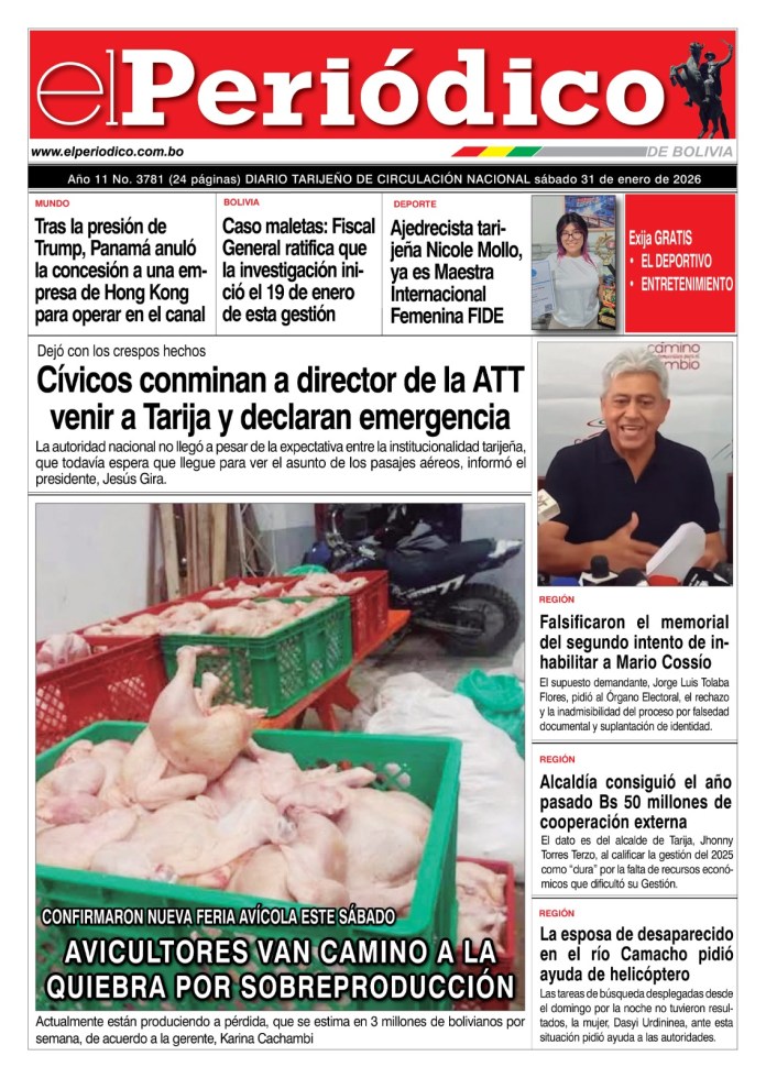 InicioTapasTapa PrincipalEdición 31-01-2026 Edición 31-01-2026 Por El Periódico 31 enero, 2026 FacebookXWhatsApp Comparte esto: Comparte en Facebook (Se abre en una ventana nueva) Facebook Compartir en X (Se abre en una ventana nueva) X ARTÍCULOS RELACIONADOS Tapa Deportivo Edición Deportiva 5-04-2026 5 abril, 2026 Tapa Principal Edición 5-04-2026 5 abril, 2026 Tapa Deportivo Edición Deportiva 4-04-2026 4 abril, 2026 LO MÁS LEIDO Edición 6-04-2026 ABC logró crédito de Bs 15 millones para reponer camino al Gran Chaco Edición 7-04-2026 Reconstrucción de variante Canaletascostará $us 40 millones, según Estudio Compulsa a favor de Procuraduría permite el reingreso petrolero a Domo Oso X-3