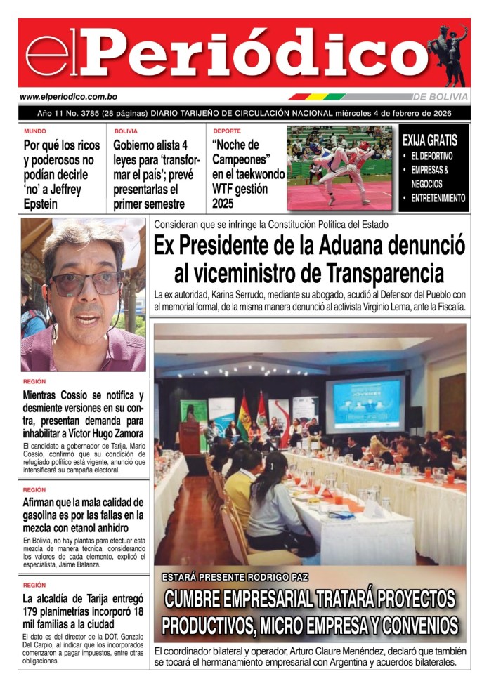 InicioTapasTapa PrincipalEdición 4-02-2026 Edición 4-02-2026 Por El Periódico 4 febrero, 2026 FacebookXWhatsApp Comparte esto: Comparte en Facebook (Se abre en una ventana nueva) Facebook Compartir en X (Se abre en una ventana nueva) X ARTÍCULOS RELACIONADOS Tapa Deportivo Edición Deportiva 3-04-2026 3 abril, 2026 Tapa Principal Edición 3-04-2026 3 abril, 2026 Tapa Salud al Día Suplemento del Día 2-04-2026 2 abril, 2026 LO MÁS LEIDO Transporte entrerriano continúa en paro y bloqueo contra el gobierno El Sedes confirmó 61 contagios de chikungunya Edición 2-04-2026 Asamblea prevé analizar la próxima semana observaciones a Ley del 45% La alcaldía tiene no más de Bs 20 millones para obras de inversión