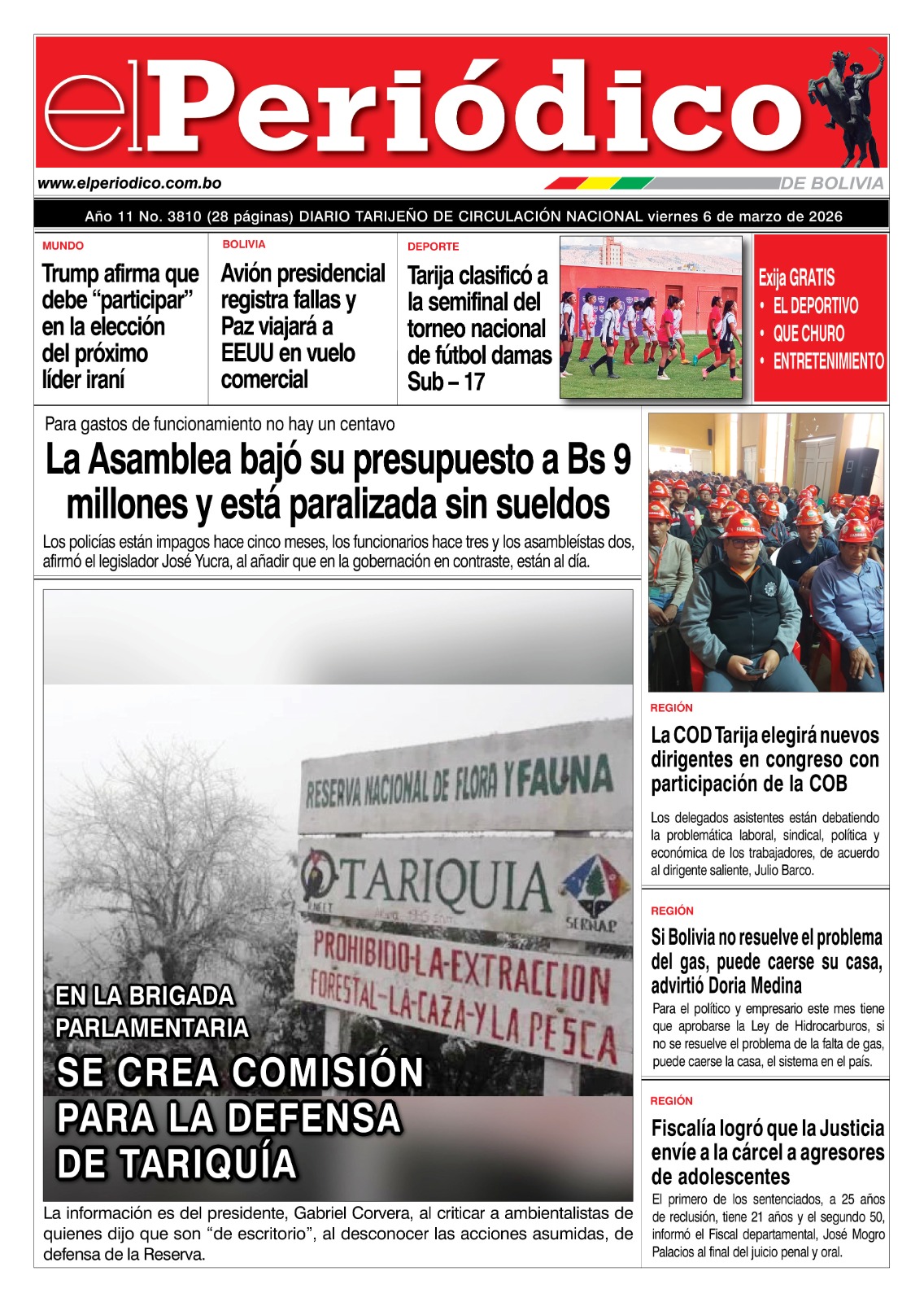InicioTapasTapa PrincipalEdición 6-03-2026 Edición 6-03-2026 Por El Periódico 6 marzo, 2026 FacebookXWhatsApp Comparte esto: Comparte en Facebook (Se abre en una ventana nueva) Facebook Compartir en X (Se abre en una ventana nueva) X ARTÍCULOS RELACIONADOS Tapa Empresas y Negocios Suplemento del Día 8-04-2026 8 abril, 2026 Tapa Deportivo Edición Deportiva 8-04-2026 8 abril, 2026 Tapa Principal Edición 8-04-2026 8 abril, 2026 LO MÁS LEIDO Edición 7-04-2026 Reconstrucción de variante Canaletascostará $us 40 millones, según Estudio Montes: nueva gobernación debe resolver deuda, exigir regalías y modificar leyes Jubileo: De $us 100 de renta petrolera el Estado toma 93 y 7 el inversionista Edición 8-04-2026