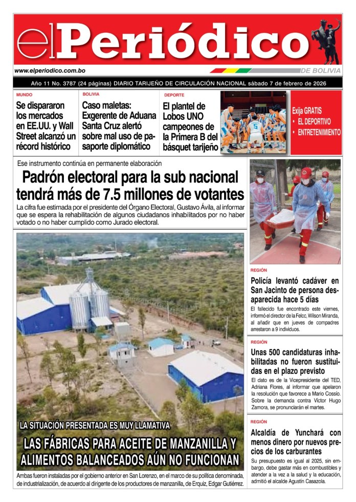InicioTapasTapa PrincipalEdición 7-02-2026 Edición 7-02-2026 Por El Periódico 7 febrero, 2026 FacebookTwitterWhatsApp Comparte esto: Comparte en Facebook (Se abre en una ventana nueva) Facebook Compartir en X (Se abre en una ventana nueva) X ARTÍCULOS RELACIONADOS Tapa Empresas y Negocios Suplemento del Día 4-02-2026 4 febrero, 2026 Tapa Deportivo Edición Deportiva 4-02-2026 4 febrero, 2026 Tapa Principal Edición 4-02-2026 4 febrero, 2026 LO MÁS LEIDO Bolivia solo tiene Bs 250 millones para caminos y precisa 1.000 millones Fiscalía: sicarios habrían cobrado $us 100 mil y Aramayo rechazó una coima “Antes no me consideraban ni para presidente de barrio” Inhabilitan a 685.684 ciudadanos: En Tarija son casi 48.000 Edición 5-02-20256