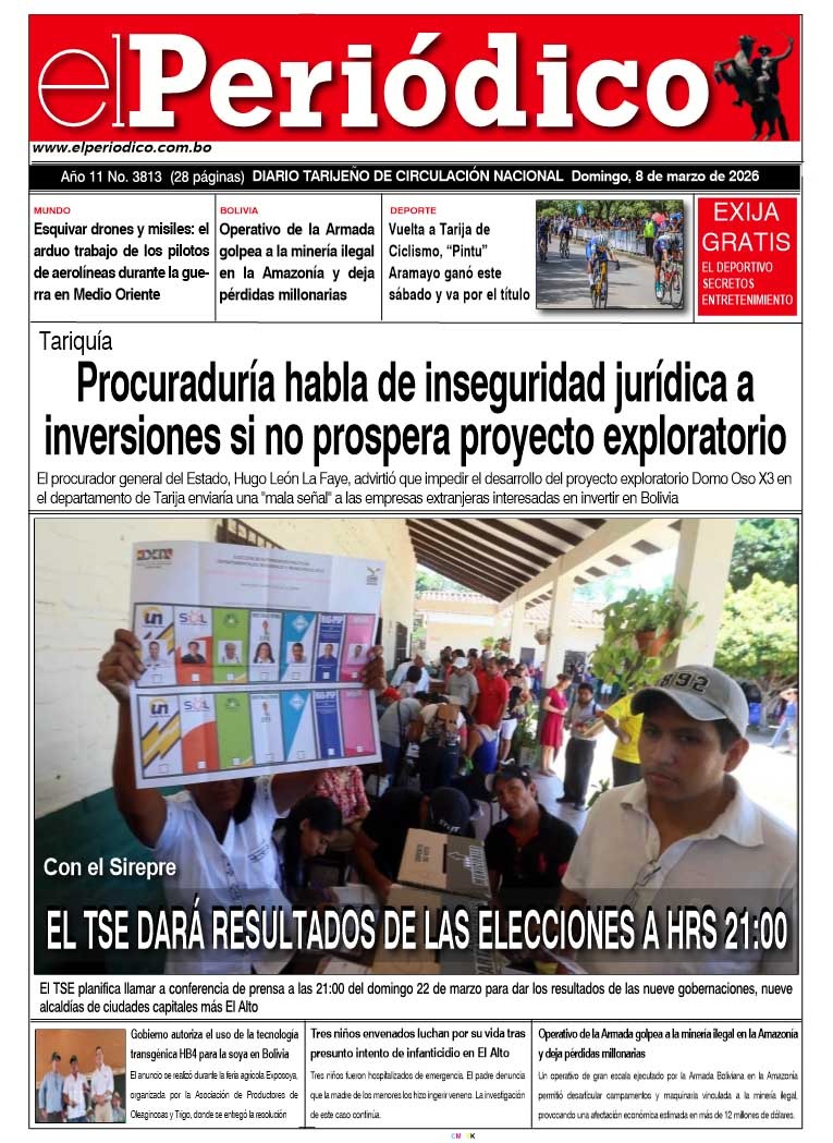 InicioTapasTapa PrincipalEdición 8-03-2026 Edición 8-03-2026 Por El Periódico 8 marzo, 2026 FacebookXWhatsApp Comparte esto: Comparte en Facebook (Se abre en una ventana nueva) Facebook Compartir en X (Se abre en una ventana nueva) X ARTÍCULOS RELACIONADOS Tapa Deportivo Edición Deportiva 5-04-2026 5 abril, 2026 Tapa Principal Edición 5-04-2026 5 abril, 2026 Tapa Deportivo Edición Deportiva 4-04-2026 4 abril, 2026 LO MÁS LEIDO Edición 6-04-2026 Edición 5-04-2026 ABC logró crédito de Bs 15 millones para reponer camino al Gran Chaco Legislativo y Órgano Judicial en polémica aparte por controlar Derechos Reales y el Notariado Choferes de Oruro anuncian paro y bloqueos desde el lunes por gasolina