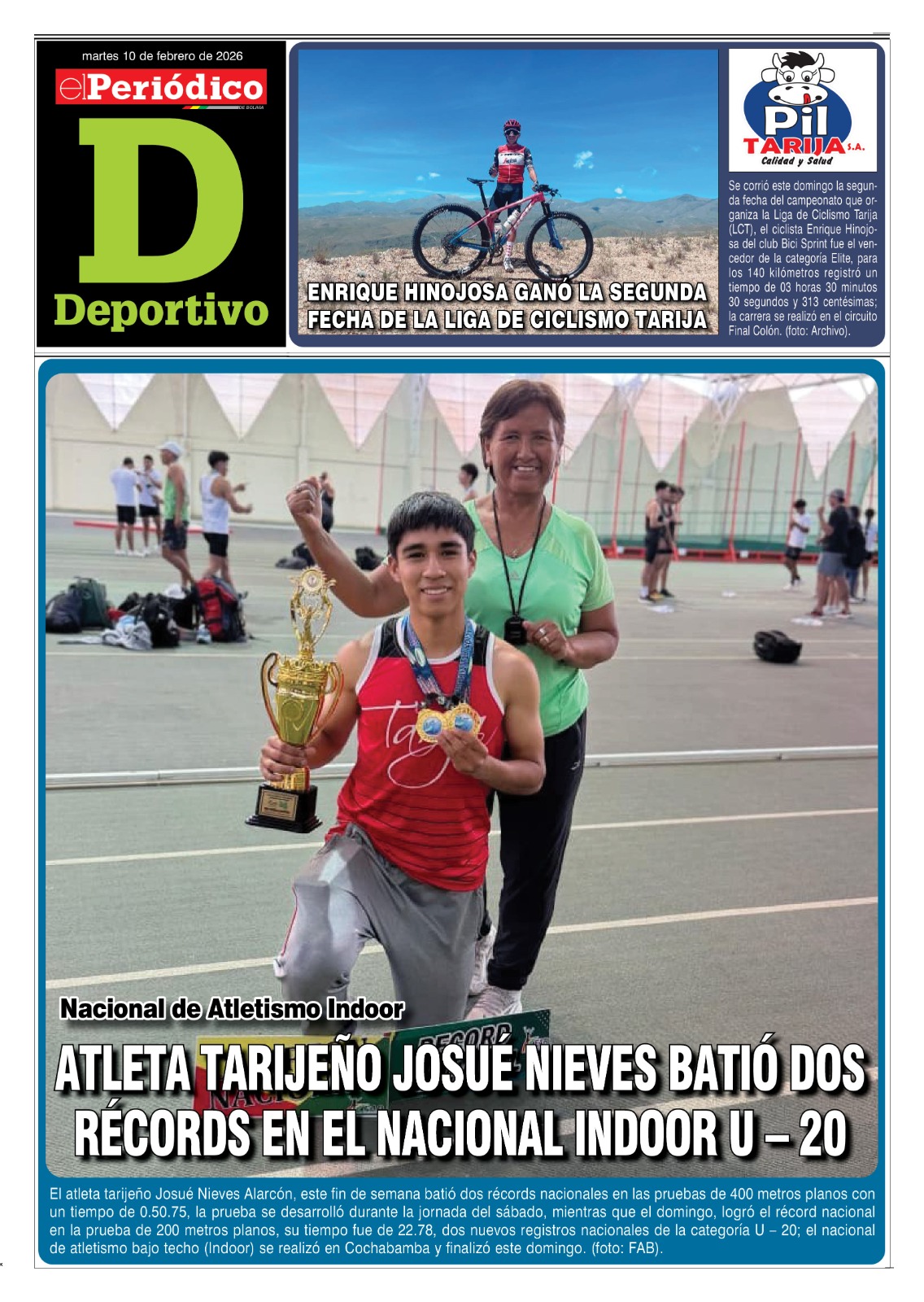 InicioTapasTapa DeportivoEdición Deportiva 10-02-2026 Edición Deportiva 10-02-2026 Por El Periódico 10 febrero, 2026 FacebookTwitterWhatsApp Comparte esto: Comparte en Facebook (Se abre en una ventana nueva) Facebook Compartir en X (Se abre en una ventana nueva) X ARTÍCULOS RELACIONADOS Tapa Tecnología Suplemento del Día 10 febrero, 2026 Tapa Principal Edición 10-02-2026 10 febrero, 2026 Tapa Economía y Energía Suplemento del Día 09-02-2026 9 febrero, 2026 LO MÁS LEIDO ABC realizó consultas para construir tramo clave del Corredor Central Sur Tragedia: Ciclista muere tras ser embestido por un vehículo Luciana Campero cuestiona a Johnny Torres y exige licencia del alcalde tras debate Edición 09-02-2026 El Chaco en emergencia por decreto para la construcción del túnel del Aguarague
