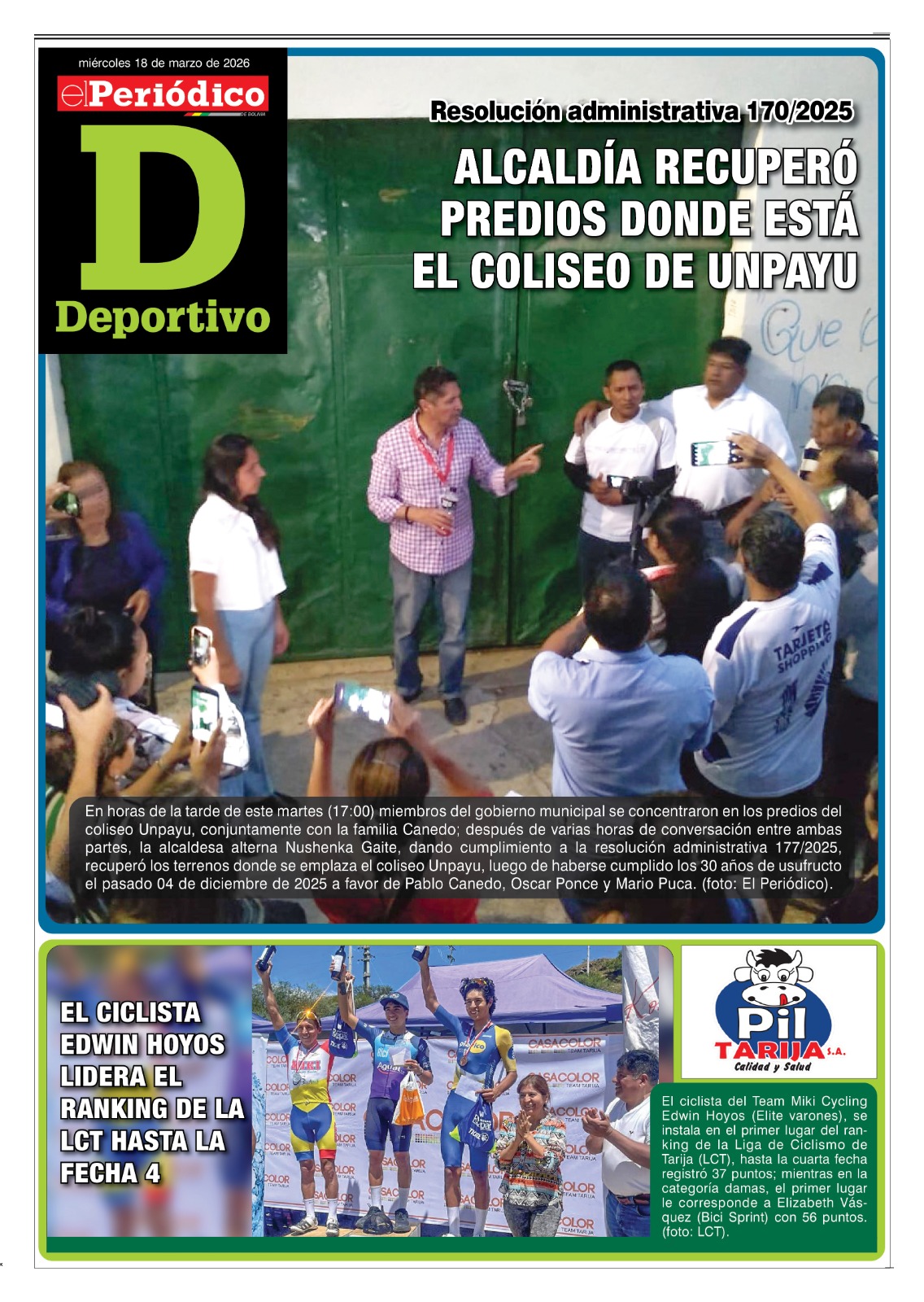 InicioTapasTapa DeportivoEdición Deportiva 18-03-2026 Edición Deportiva 18-03-2026 Por El Periódico 18 marzo, 2026 FacebookXWhatsApp Comparte esto: Comparte en Facebook (Se abre en una ventana nueva) Facebook Compartir en X (Se abre en una ventana nueva) X ARTÍCULOS RELACIONADOS Tapa Principal Edición 21-04-2026 21 abril, 2026 Tapa Deportivo Edición Deportiva 21-04-2026 21 abril, 2026 Tapa Salud al Día Suplemento del Día 16-04-2026 16 abril, 2026 LO MÁS LEIDO El Gobierno busca destrabar tensiones con transportistas en Tarija Universidades estatales quieren invertir en empresas para crear fuentes de empleo Edición 18-04-2026 Tres fallecidos por fiebre amarilla en Santa Cruz alertan al Sedes 50-50 modificará Ley de Autonomías y reordenará el esquema de competencias