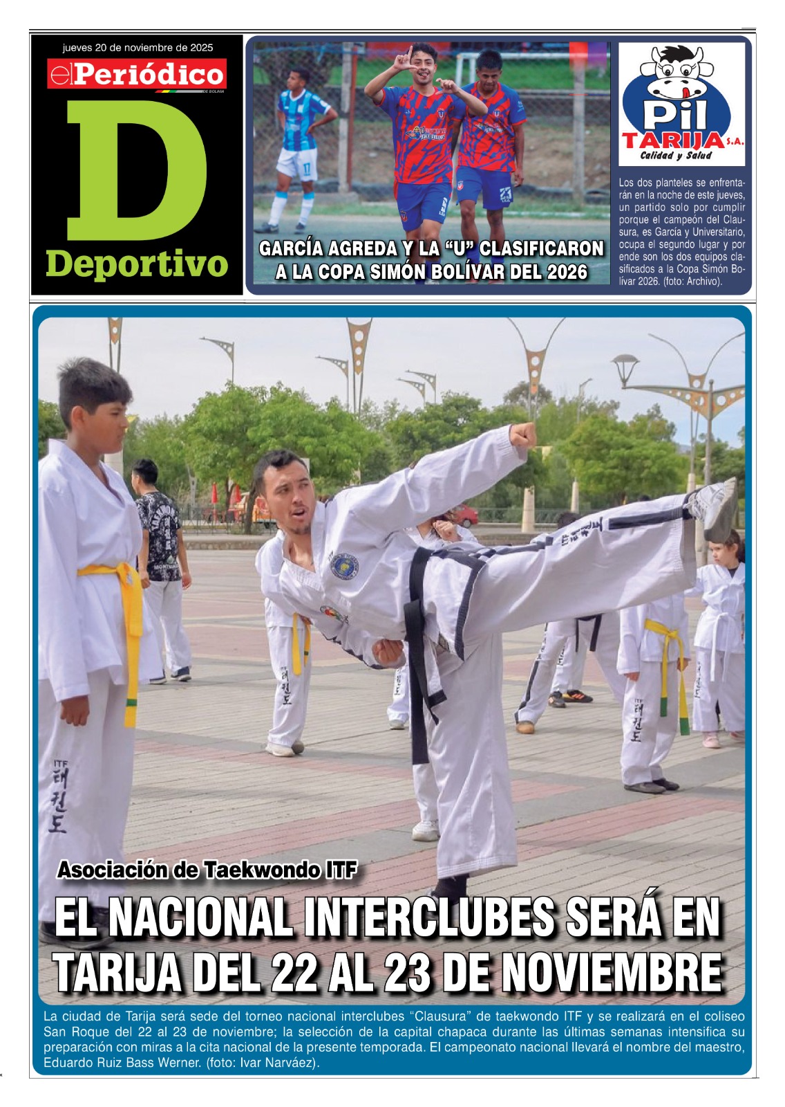 InicioTapasTapa DeportivoEdición Deportiva 20-11-2025 Edición Deportiva 20-11-2025 Por El Periódico 20 noviembre, 2025 FacebookXWhatsApp Comparte esto: Comparte en Facebook (Se abre en una ventana nueva) Facebook Compartir en X (Se abre en una ventana nueva) X ARTÍCULOS RELACIONADOS Tapa Tecnología Suplemento del Día 28-04-2026 28 abril, 2026 Tapa Deportivo Edición Deportiva 28-04-2026 28 abril, 2026 Tapa Principal Edición 28-04-2026 28 abril, 2026 LO MÁS LEIDO Gobernadora calificó de “preocupante y alarmante” datos de situación financiera Nuevo aumento salarial inviabilizaría a “un montón” de empresas públicas Planta de cítricos no funcionará nunca reconoció el subgobernador de Bermejo La ABC ejecuta Plan de Emergencia en rutas de Tarija, Santa Cruz y La Paz Tarija: detención preventiva para acusado de matar a golpes a joven en céntrica avenida