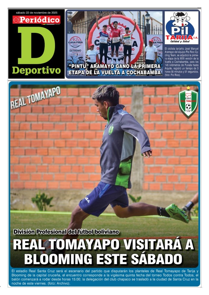 InicioTapasTapa DeportivoEdición Deportiva 22-11-2025 Edición Deportiva 22-11-2025 Por El Periódico 22 noviembre, 2025 FacebookXWhatsApp Comparte esto: Comparte en Facebook (Se abre en una ventana nueva) Facebook Compartir en X (Se abre en una ventana nueva) X ARTÍCULOS RELACIONADOS Tapa Deportivo Edición Deportiva 3-04-2026 3 abril, 2026 Tapa Principal Edición 3-04-2026 3 abril, 2026 Tapa Salud al Día Suplemento del Día 2-04-2026 2 abril, 2026 LO MÁS LEIDO Transporte entrerriano continúa en paro y bloqueo contra el gobierno El Sedes confirmó 61 contagios de chikungunya Edición 2-04-2026 La alcaldía tiene no más de Bs 20 millones para obras de inversión 40% de puestos de venta en mercados municipales están sin uso y vacíos