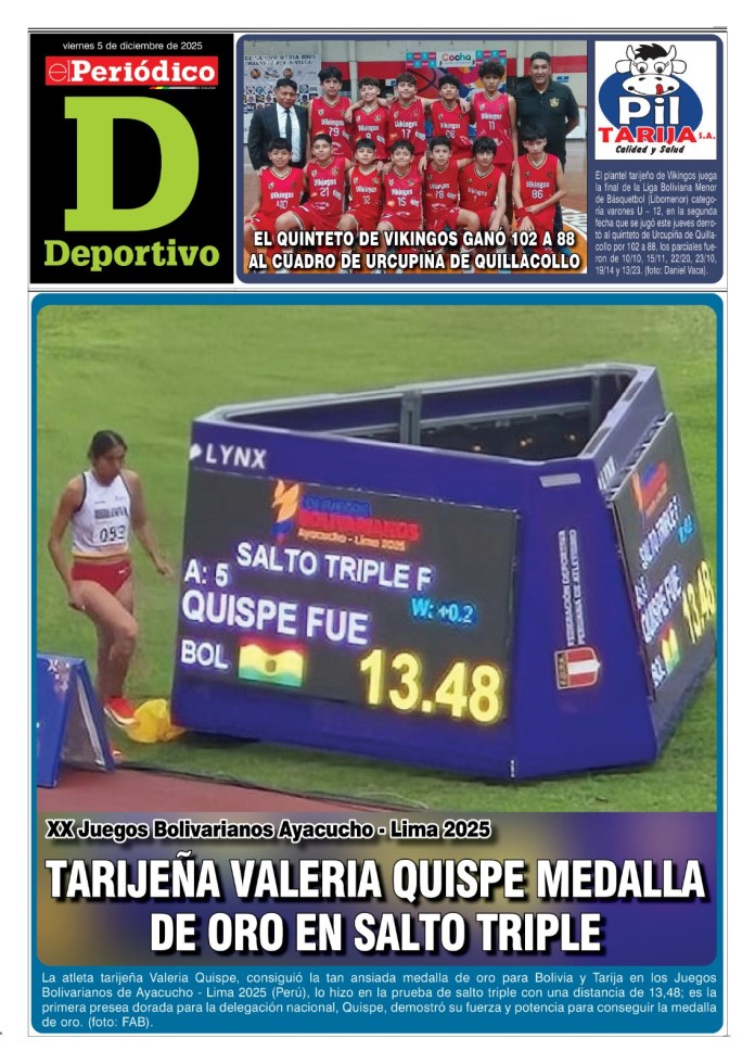 InicioTapasTapa DeportivoEdición Deportiva 5-12-2025 Edición Deportiva 5-12-2025 Por El Periódico 5 diciembre, 2025 FacebookXWhatsApp Comparte esto: Comparte en Facebook (Se abre en una ventana nueva) Facebook Compartir en X (Se abre en una ventana nueva) X ARTÍCULOS RELACIONADOS Tapa Deportivo Edición Deportiva 5-04-2026 5 abril, 2026 Tapa Principal Edición 5-04-2026 5 abril, 2026 Tapa Deportivo Edición Deportiva 4-04-2026 4 abril, 2026 LO MÁS LEIDO Edición 6-04-2026 Edición 5-04-2026 ABC logró crédito de Bs 15 millones para reponer camino al Gran Chaco Legislativo y Órgano Judicial en polémica aparte por controlar Derechos Reales y el Notariado Choferes de Oruro anuncian paro y bloqueos desde el lunes por gasolina