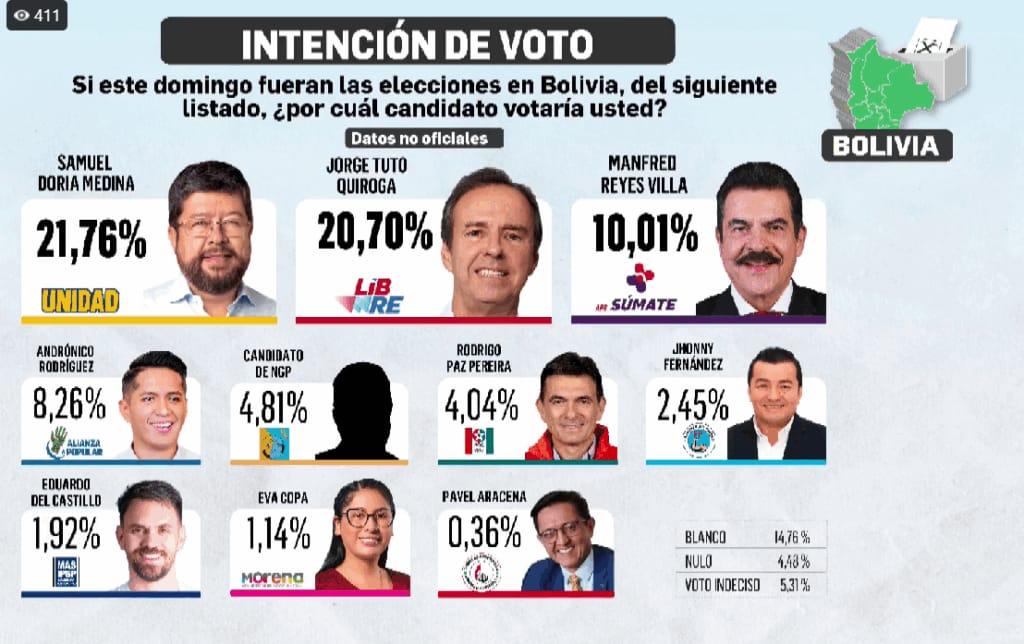 Interpretando los resultados de la segunda encuesta de la consultora Focaliza, contratada por el Gobierno Autónomo Departamental de Santa Cruz, Torres señaló que «entre Samuel Doria Medina, Tuto Quiroga y Manfred Reyes Villa ya se supera el 50% de apoyo, lo que muestra que la tendencia opositora va en aumento». Afirmó que el oficialismo está siendo «desplazado a lugares marginales» en la preferencia electoral.