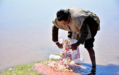 Los pobladores de las comunidades Urus, etnia ancestral que por años vivió con los recursos que proveía el lago, realizaron un ritual de pago a la Pachamama.