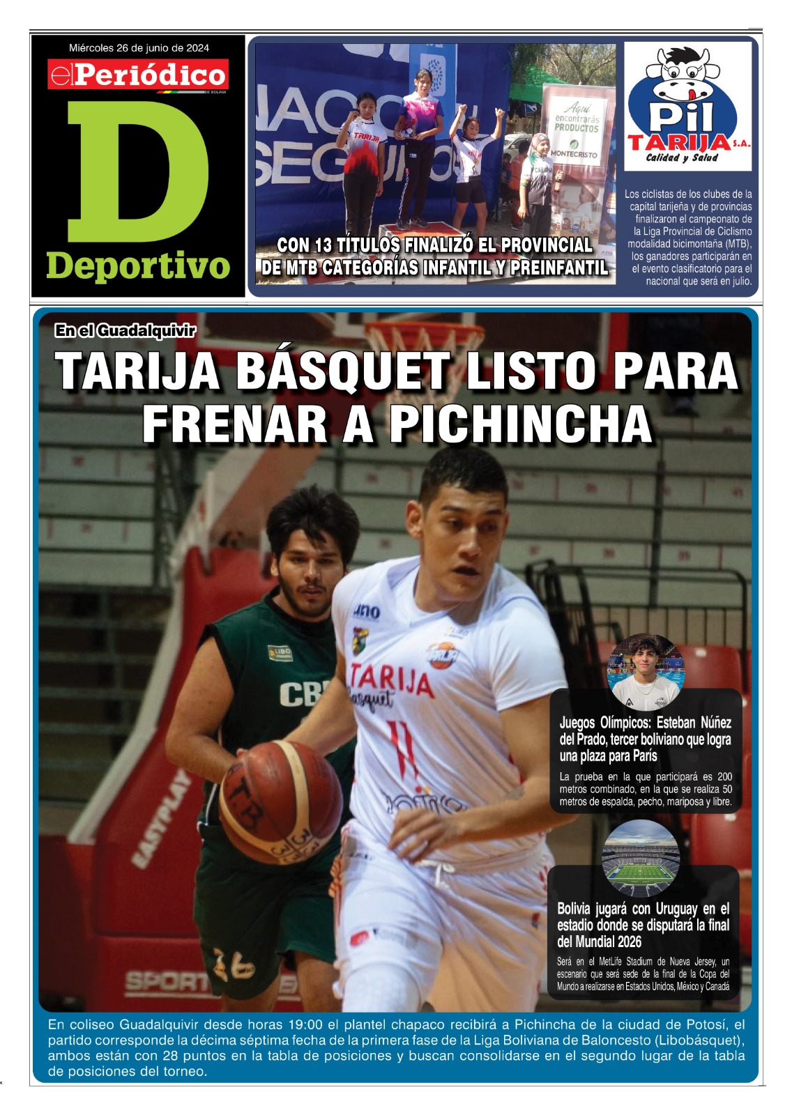InicioTapasTapa DeportivoPortada Deportes Portada Deportes Por El Periódico 26 junio, 2024 FacebookXWhatsApp Comparte esto: Comparte en Facebook (Se abre en una ventana nueva) Facebook Compartir en X (Se abre en una ventana nueva) X ARTÍCULOS RELACIONADOS Tapa Deportivo Edición Deportiva 3-04-2026 3 abril, 2026 Tapa Principal Edición 3-04-2026 3 abril, 2026 Tapa Salud al Día Suplemento del Día 2-04-2026 2 abril, 2026 LO MÁS LEIDO Transporte entrerriano continúa en paro y bloqueo contra el gobierno El Sedes confirmó 61 contagios de chikungunya Edición 2-04-2026 La alcaldía tiene no más de Bs 20 millones para obras de inversión 40% de puestos de venta en mercados municipales están sin uso y vacíos