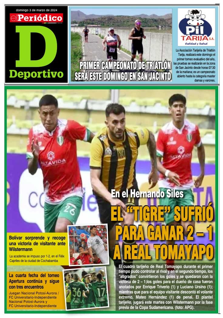 InicioTapasTapa DeportivoPortada Deportes Portada Deportes Por El Periódico 3 marzo, 2024 FacebookXWhatsApp Comparte esto: Comparte en Facebook (Se abre en una ventana nueva) Facebook Compartir en X (Se abre en una ventana nueva) X ARTÍCULOS RELACIONADOS Tapa Deportivo Edición Deportiva 5-04-2026 5 abril, 2026 Tapa Principal Edición 5-04-2026 5 abril, 2026 Tapa Deportivo Edición Deportiva 4-04-2026 4 abril, 2026 LO MÁS LEIDO Edición 5-04-2026 Choferes de Oruro anuncian paro y bloqueos desde el lunes por gasolina Legislativo y Órgano Judicial en polémica aparte por controlar Derechos Reales y el Notariado Edición Deportiva 5-04-2026 Bermejo: la deuda histórica que sigue sin resolverse