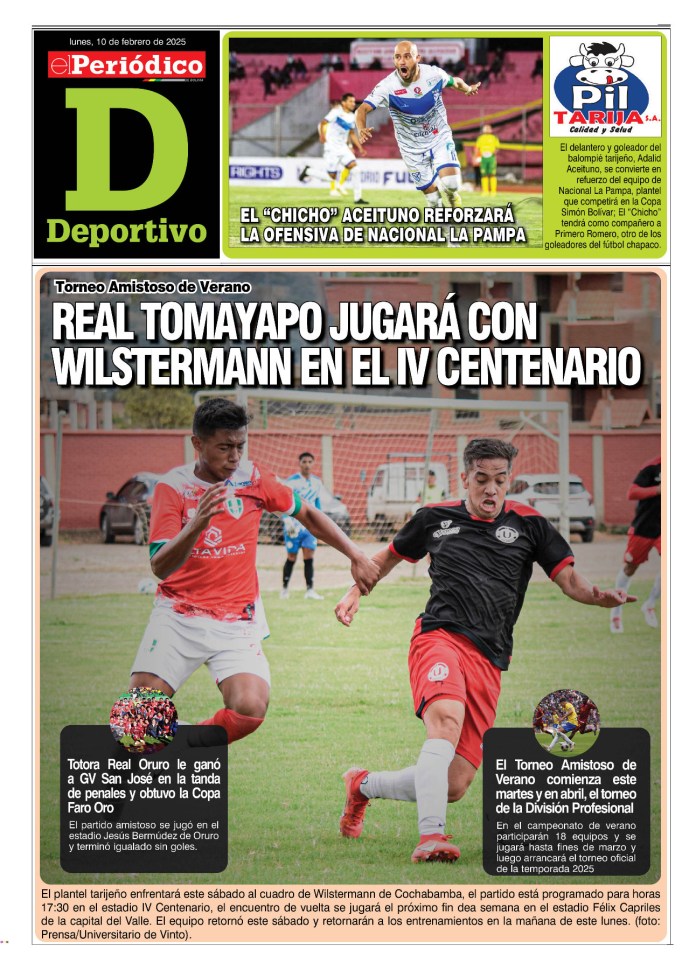 InicioTapasTapa DeportivoPortada Deportiva 10-02-2025 Portada Deportiva 10-02-2025 Por El Periódico 10 febrero, 2025 FacebookXWhatsApp Comparte esto: Comparte en Facebook (Se abre en una ventana nueva) Facebook Compartir en X (Se abre en una ventana nueva) X ARTÍCULOS RELACIONADOS Tapa Empresas y Negocios Suplemento del Día 8-04-2026 8 abril, 2026 Tapa Deportivo Edición Deportiva 8-04-2026 8 abril, 2026 Tapa Principal Edición 8-04-2026 8 abril, 2026 LO MÁS LEIDO Jubileo: De $us 100 de renta petrolera el Estado toma 93 y 7 el inversionista Edición 8-04-2026 Barra Chocolates: Grandeza y Humildad del Espíritu Chaqueño Edición 9-04-2026 Parlamentarios no conocen contratos firmados para importar la gasolina