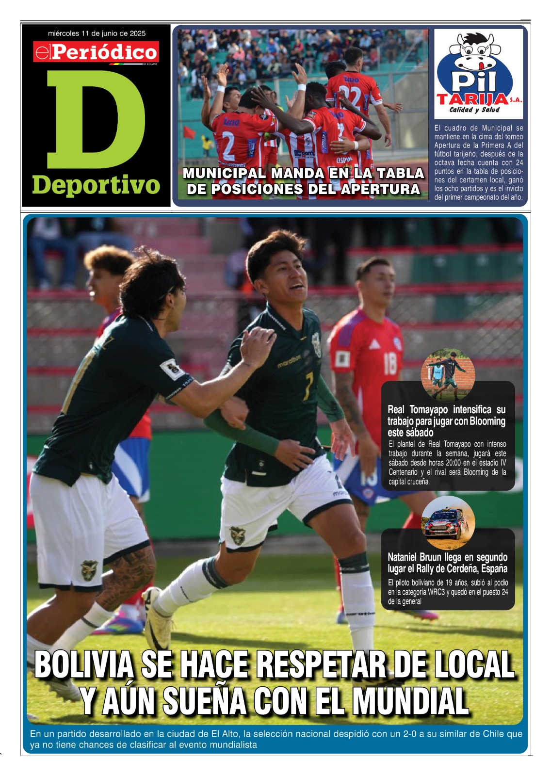 InicioTapasTapa DeportivoPortada Deportiva 11-06-2025 Portada Deportiva 11-06-2025 Por El Periódico 11 junio, 2025 FacebookXWhatsApp Comparte esto: Comparte en Facebook (Se abre en una ventana nueva) Facebook Compartir en X (Se abre en una ventana nueva) X ARTÍCULOS RELACIONADOS Tapa Deportivo Edición Deportiva 12-04-2026 12 abril, 2026 Tapa Que Churo Suplemento del Día 10 abril, 2026 Tapa Deportivo Edición Deportiva 10-04-2026 10 abril, 2026 LO MÁS LEIDO Ministerio de Salud despidió a cinco enfermeras y dejó al PAI sin personal Edición 11-04-2026 Diputados aprobaron financiamiento de $us 65 millones para planta de tratamiento Vecinos capturan y castigan a presunto ladrón en el Plan 3000 Presidente de Asamblea promulgó ley de turismo tras observación del gobernador