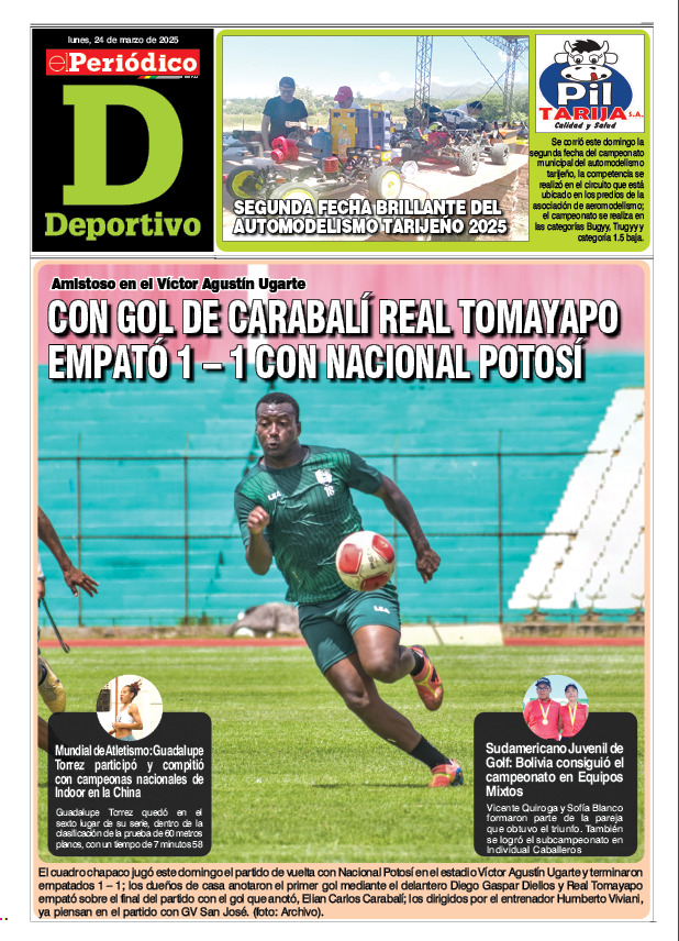 InicioTapasTapa DeportivoPortada Deportiva 24-03-2025 Portada Deportiva 24-03-2025 Por El Periódico 24 marzo, 2025 FacebookXWhatsApp Comparte esto: Comparte en Facebook (Se abre en una ventana nueva) Facebook Compartir en X (Se abre en una ventana nueva) X ARTÍCULOS RELACIONADOS Tapa Deportivo Edición Deportiva 5-04-2026 5 abril, 2026 Tapa Principal Edición 5-04-2026 5 abril, 2026 Tapa Deportivo Edición Deportiva 4-04-2026 4 abril, 2026 LO MÁS LEIDO Choferes de Oruro anuncian paro y bloqueos desde el lunes por gasolina Legislativo y Órgano Judicial en polémica aparte por controlar Derechos Reales y el Notariado Edición 5-04-2026 Edición Deportiva 5-04-2026 Rodrigo Paz anticipa que el lunes hará anuncios de “temas impositivos”