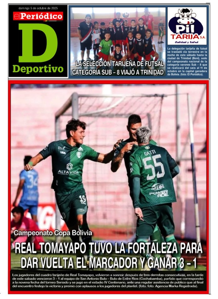 InicioTapasTapa DeportivoPortada Deportiva 5-10-2025 Portada Deportiva 5-10-2025 Por El Periódico 5 octubre, 2025 FacebookXWhatsApp Comparte esto: Comparte en Facebook (Se abre en una ventana nueva) Facebook Compartir en X (Se abre en una ventana nueva) X ARTÍCULOS RELACIONADOS Tapa Tecnología Suplemento del Día 28-04-2026 28 abril, 2026 Tapa Deportivo Edición Deportiva 28-04-2026 28 abril, 2026 Tapa Principal Edición 28-04-2026 28 abril, 2026 LO MÁS LEIDO Gobernadora calificó de “preocupante y alarmante” datos de situación financiera Nuevo aumento salarial inviabilizaría a “un montón” de empresas públicas Planta de cítricos no funcionará nunca reconoció el subgobernador de Bermejo Tarija: detención preventiva para acusado de matar a golpes a joven en céntrica avenida La ABC ejecuta Plan de Emergencia en rutas de Tarija, Santa Cruz y La Paz
