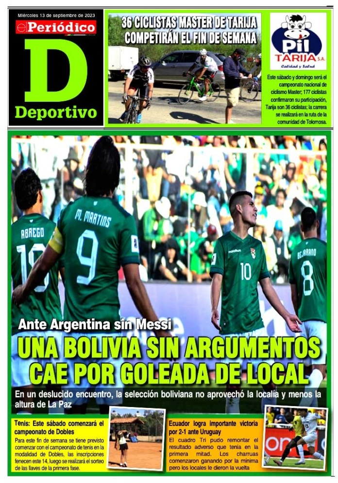 InicioTapasTapa DeportivoPortada Deportivo Portada Deportivo Por El Periódico 13 septiembre, 2023 FacebookXWhatsApp Comparte esto: Comparte en Facebook (Se abre en una ventana nueva) Facebook Compartir en X (Se abre en una ventana nueva) X ARTÍCULOS RELACIONADOS Tapa Deportivo Edición Deportiva 5-04-2026 5 abril, 2026 Tapa Deportivo Edición Deportiva 4-04-2026 4 abril, 2026 Tapa Deportivo Edición Deportiva 3-04-2026 3 abril, 2026 LO MÁS LEIDO Edición 7-04-2026 Reconstrucción de variante Canaletascostará $us 40 millones, según Estudio Montes: nueva gobernación debe resolver deuda, exigir regalías y modificar leyes Edición 6-04-2026 El alcalde llevará ante el gobierno proyectos por unos Bs 60 millones