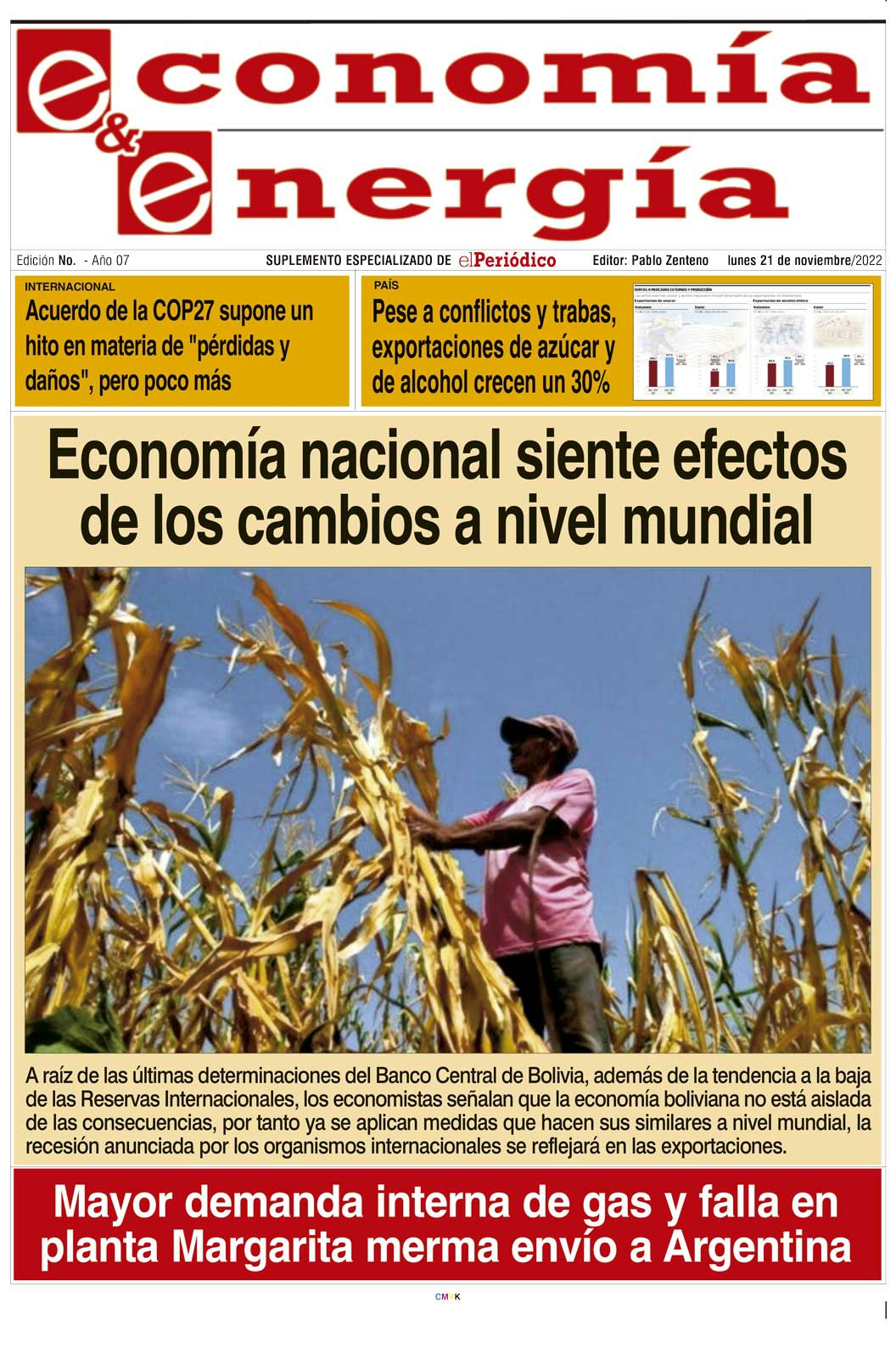 InicioTapasTapa Economía y EnergíaPortada Economía Portada Economía Por El Periódico 21 noviembre, 2022 FacebookXWhatsApp Comparte esto: Comparte en Facebook (Se abre en una ventana nueva) Facebook Compartir en X (Se abre en una ventana nueva) X ARTÍCULOS RELACIONADOS Tapa Economía y Energía Suplemento del Día 30-03-2026 30 marzo, 2026 Tapa Economía y Energía Suplemento del Día 16-03-2026 16 marzo, 2026 Tapa Economía y Energía Suplemento del Día 9-03-2026 9 marzo, 2026 LO MÁS LEIDO Tarija: detención preventiva para acusado de matar a golpes a joven en céntrica avenida Nombran nuevo comandante en Tarija para fortalecer la gestión institucional Prevén beneficiar a 52 mil contribuyentes con la ley aprobada de alivio tributario Economista estima que el precio del dólar continuará subiendo en el país Transporte pesado alista bloqueos en La Paz por diésel, conflictos empresariales y camiones retenidos en Perú