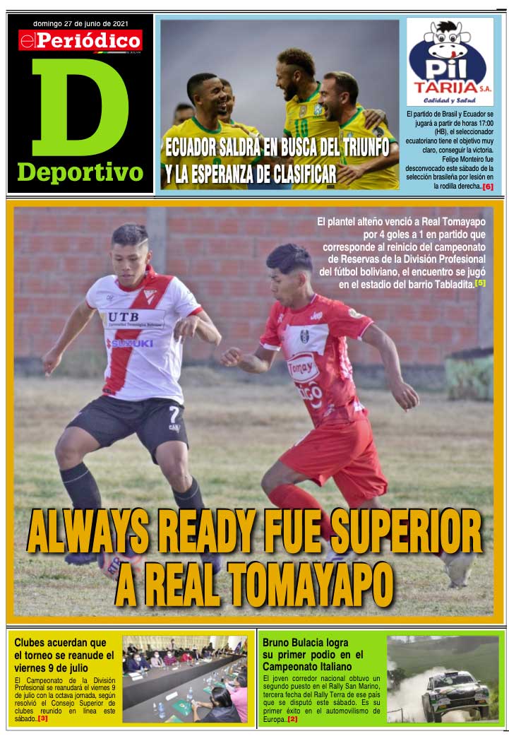 InicioTapasTapa DeportivoTapa deportivo Tapa deportivo Por El Periódico 27 junio, 2021 FacebookXWhatsApp Comparte esto: Comparte en Facebook (Se abre en una ventana nueva) Facebook Compartir en X (Se abre en una ventana nueva) X ARTÍCULOS RELACIONADOS Tapa Deportivo Edición Deportiva 16-04-2026 16 abril, 2026 Tapa Deportivo Edición Deportiva 12-04-2026 12 abril, 2026 Tapa Deportivo Edición Deportiva 10-04-2026 10 abril, 2026 LO MÁS LEIDO Árabes y chinos dispuestos a invertir $us 1.300 millones en proyecto “Carrizal” Hallan el cadáver de una mujer en una bolsa de yute y activan investigación Edición 17-04-2026 Gobierno gestiona dinero en EE UU para estabilizar economía quebrada del país EMAT espera aplicar nueva tasa de recojo de basura tras cambio de autoridades