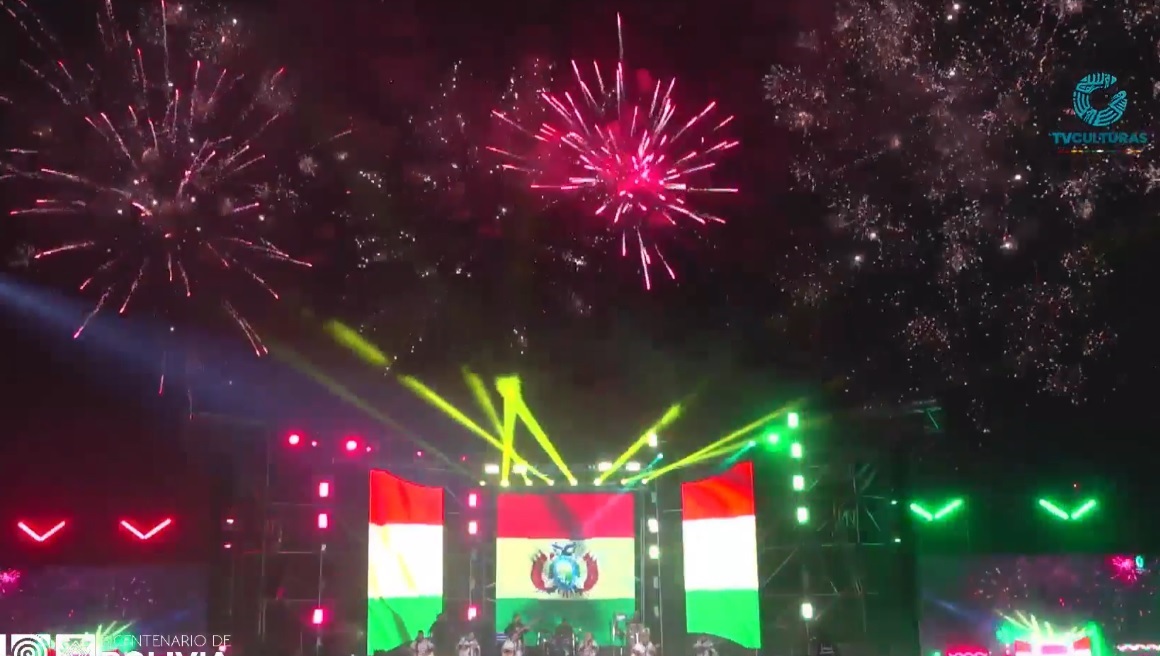 Bolivia recibió este miércoles 6 de agosto sus 200 años de Independencia con un espectáculo de fuegos artificiales en el estadio Patria de Sucre, capital del país, durante la Serenata alusiva a la fecha.